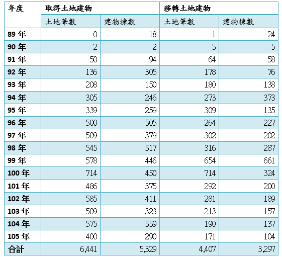 本府自民國89年迄民國105年底止,共計核准取得或移轉土地建物案件計 10,848筆8,626棟(如下表)。